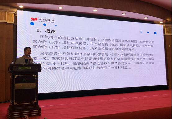 世林膠業(yè)劉工在環(huán)氧應(yīng)用技術(shù)學(xué)術(shù)交流會(huì)上進(jìn)行《聚氨酯改性環(huán)氧樹(shù)脂對(duì)環(huán)氧樹(shù)脂性能影響的研究》的演講。